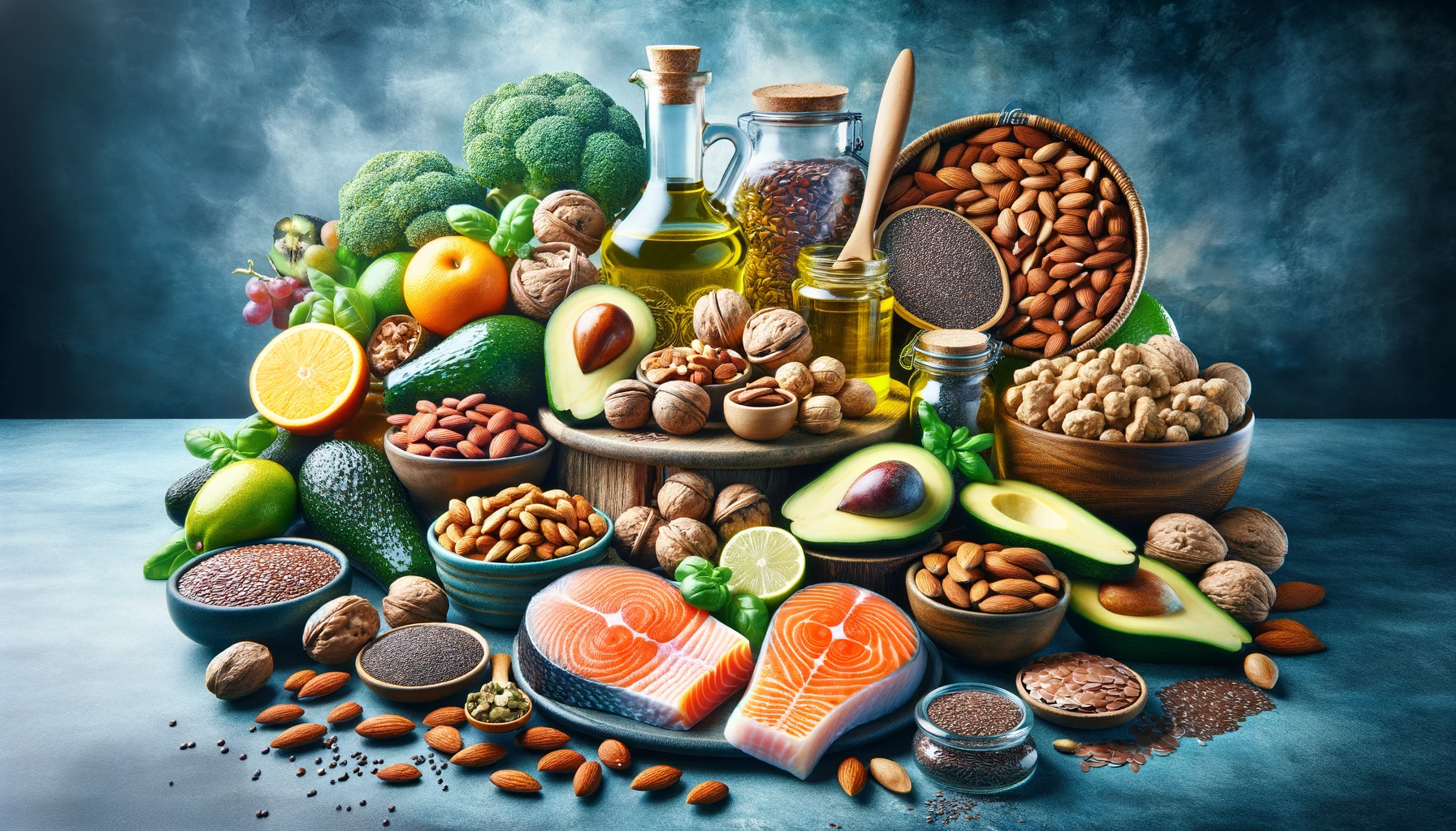 DALL·E 2024-03-06 15.03.29 – A vibrant and visually appealing composition focusing on healthy and balanced nutrition, specifically emphasizing fats without any text or words. This