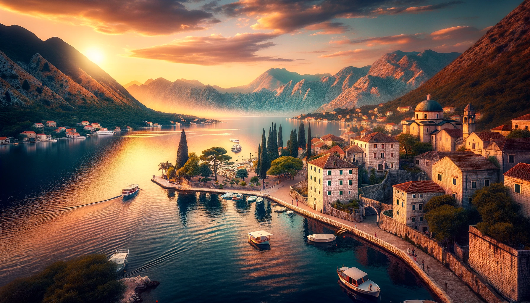 DALL·E 2024-03-15 21.22.55 – A breathtaking landscape view of the Bay of Kotor in Montenegro. The scene is captured during the golden hour, with the sun setting over the distant m
