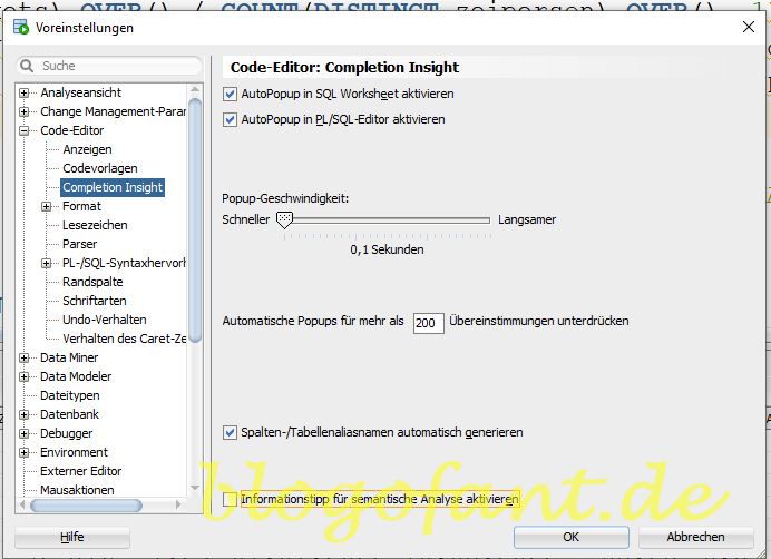 Ein weiterer Punkt ist die Deaktivierung des „Informationtipps für die semantische Analyse“. Dieses Punkt macht die Ausführung deiner Scripts um einiges schneller und sollte unbedingt vorgenommen werden. Die Deaktivierung kannst du unter den Einstellungen unter Code-Editor >> Completion Insights vornehmen. In den meisten Fällen sorgt dieser Punkt für einen langen Ausführungszeitraums vom SQL Developer und lasst vor allem lange Abfragen langsam erscheinen.