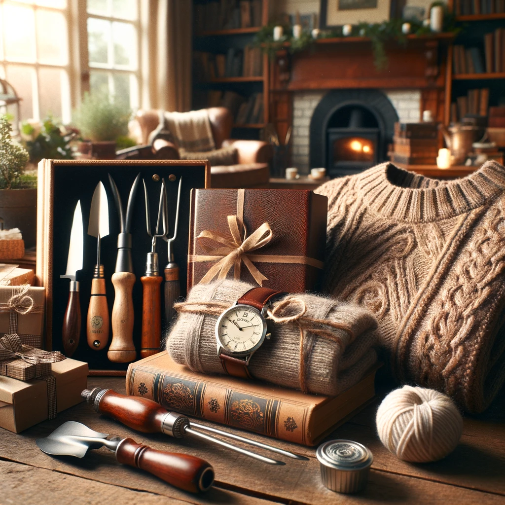 DALL·E 2024 03 21 07.58.51 A heartwarming scene of a variety of birthday gifts for grandfathers arranged thoughtfully on a wooden table. The collection includes a vintage l