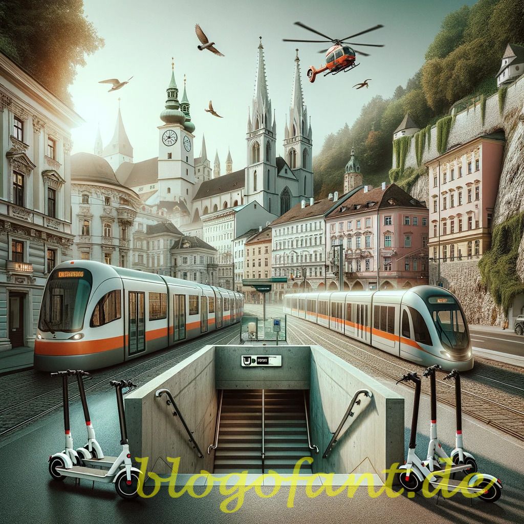 DALL·E 2023-10-20 10.45.54 – Photo-styled image of Graz where modern meets traditional_ an underground U-Bahn station entrance, a Stadtseilbahn station, electric scooters, and tra