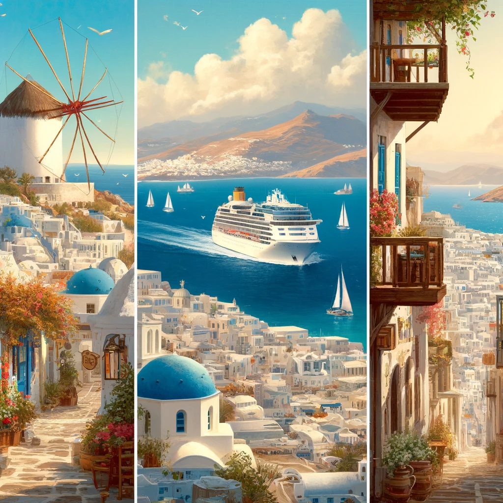 DALL·E 2024-04-04 15.40.15 – Create three images inspired by Mykonos, Greece. For two of these images, include a luxurious cruise ship docked near the island, integrating seamless