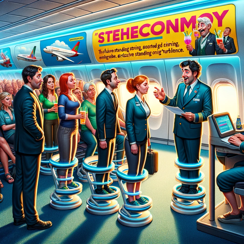 DALL·E 2024-02-13 17.13.30 – In a satirical and futuristic airport setting, a group of passengers is seen checking in for a _Steheconomy_ flight. The passengers, showing a mix of