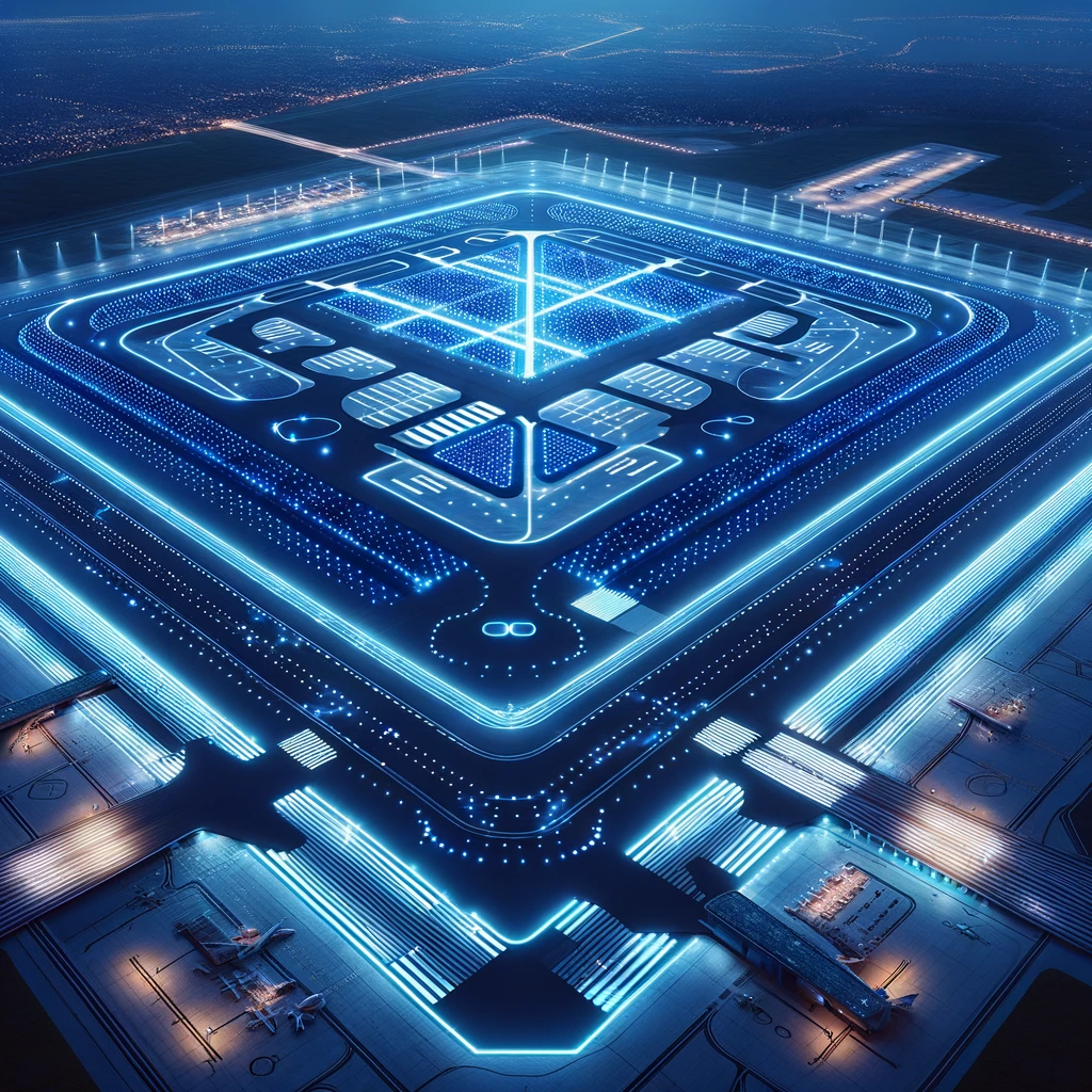 DALL·E 2024-02-08 13.08.14 – A futuristic airport featuring a massive 3 x 3 km square-shaped runway, illuminated with bright blue LED lights along its edges and intricate patterns