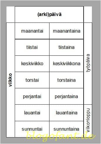 Die Woche (viikko) unterteilt sich in die Wochentage Montag – Freitag, also werktags (työpäivä) und den Tagen Samstag und Sonntag, also Wochenende (viikonloppu). Die Tage von Montag bis Sonntag lauten: maanantai, tiistai, keskiviikko, torstai, perjantai, lauantai und sunnuntai.