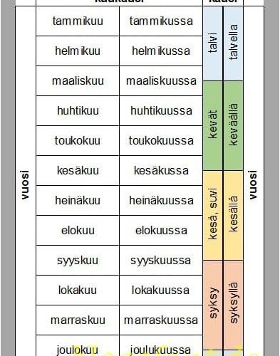 Das Jahr (vuosi) unterteilt sich in 12 Monate (kuukausi) und 4 Jahreszeiten (kausi). Diese sind Frühling (kevät), Sommer (kesä oder suvi), Herbst (syksy) und Winter (talvi). Die Monate von Jänner bis Dezember lauten tammikuu, helmikuu, maaliskuu, huhtikuu, toukokuu, kesäkuu, heinäkuu, elokuu, syyskuu, lokakuu, marraskuu und joulokuu.