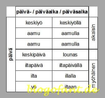 Der Tag (päivä) unterteilt sich in früh (aikaisin) und spät (myöhäinen). Zudem in die Tageszeiten Mitternacht (keskiyö), Morgen und Vormittag (aamu), Mittag (keskipäivä), Nachmittag (iltapäivä), Abend (ilta) und Nacht (yö). Die zweite Spalte beschreibt die Uhrzeitangabe z.B. zu Mitternacht (keskiyöllä) und wird im Finnischen mit dem Adessiv (einer der äußereren Lokalfällen) gebildet.