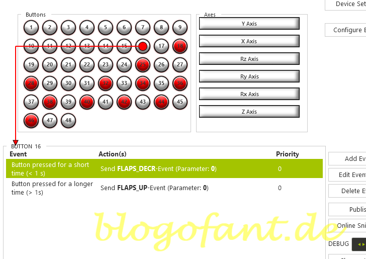 Um die Klappen um eine Stufe einzufahren wird die Variable FLAPS_DECR verwendet. Damit werden die Klappen um eine Stufe eingefahren. Mit der Variable FLAPS_UP werden die Klappen vollständig eingefahren und dies wird durch einen langen Druck auf Button 16 ausgelöst.
