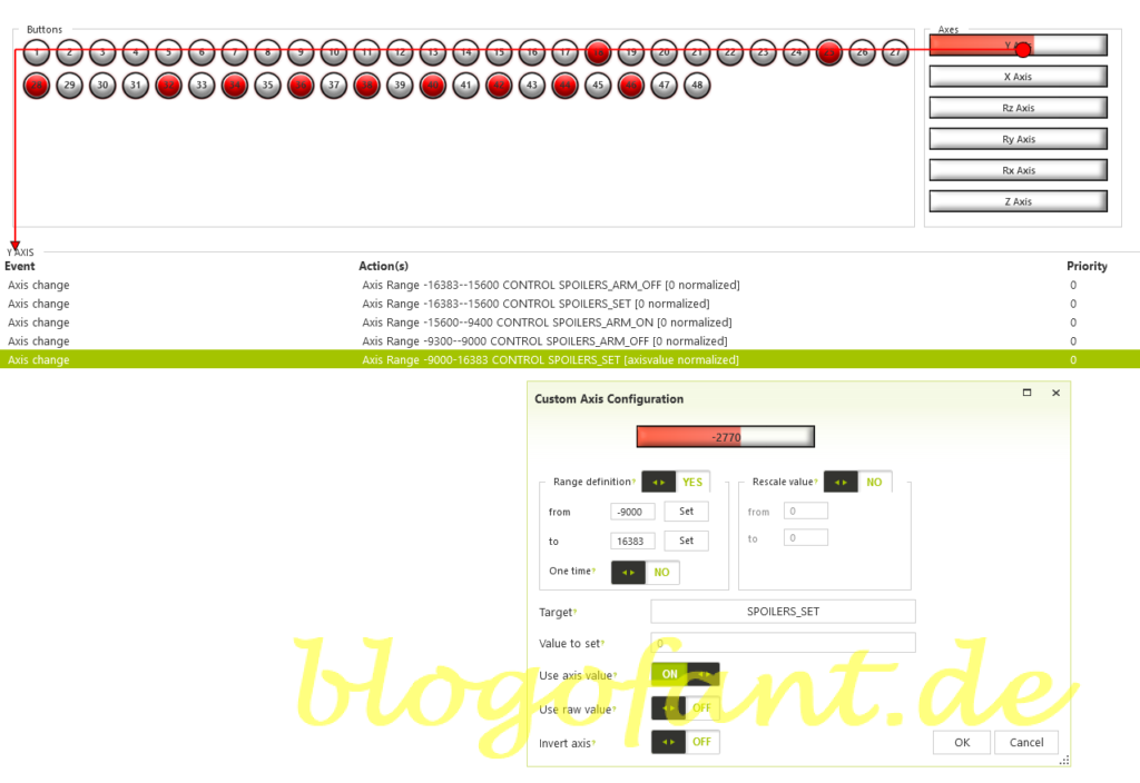 Das Luftbremsensetup soll einerseits durchgängig werden und andererseits auch die Möglichkeiten bieten die Spoilers in die ARM Position zu setzten. Aus diesem Grund wird die Einstellung über Spad Next vorgenommen über das Event „Custom Axis“. Dabei wird auf nachfolgende Events zurückgegriffen: