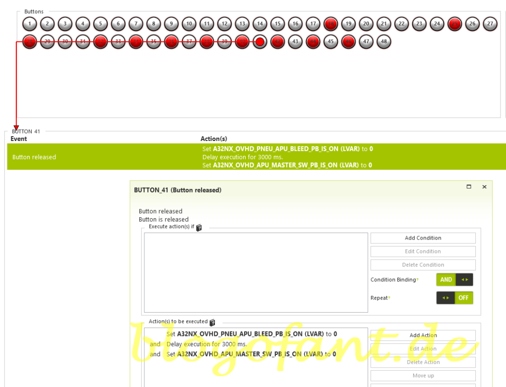 Beachte, dass es sich hier um ein Button Release Event handelt. Die Konfiguration ist recht einfach, denn du musst lediglich die Bleed als auch den Power Switch der APU ausschalten. Mit der LVAR A32NX__OVHD_PNEU_APU_BLEED_PB_IS_ON mit dem Parameter 0 wird die APU Bleed deaktiviert. Anschließend ist eine Pause von 3000ms (3 Sekunden) eingeführt. Mit der LVAR A32NX_OVHD_APU_MASTER_SW_PB_IS_ON und dem Parameter 0 schaltest du die APU aus.
