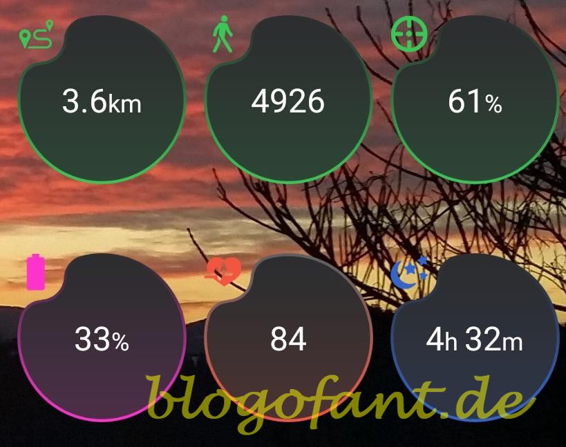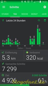 As with sleep, there is also the option to switch between day, week, month and year. In addition, there is the sub-item hour, which displays the data of the last hour. It also displays distances and calories as well as steps taken. Of course, these values will be adjusted depending on the time period displayed. In the last line you can see the personal goal (made steps on this day until now) including set goal and percentage. In the settings there is the possibility to show the number of steps in real time. This is usually activated and offers the possibility to use the widgets in a meaningful way. The fact that really more battery is consumed, I can not confirm so.