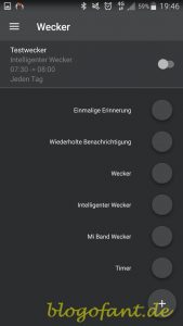 The alarm clocks have a large selection. It can be chosen between timer, Mi band alarm clock, smart alarm clock, alarm clock, repeated notification and one-time reminder. The similarities are that all can be tested in the menu with the Play button or can be deleted with the recycle bin. In addition, the type of notification can be selected. You can choose from icons, custom vibrations, custom text, or a custom template. Templates can be created from icons, custom vibrations, delays and texts. The intelligent alarm clock wakes up a certain period of time (freely selectable) beforehand, if you are not in deep sleep.